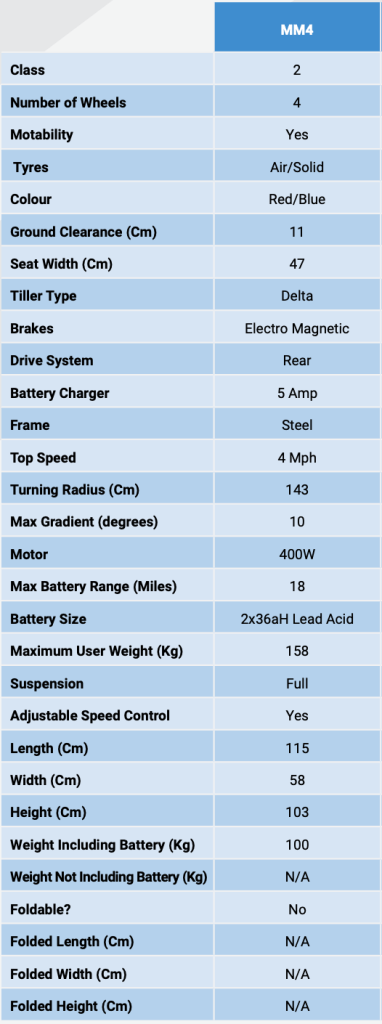 It’s easy to see why the MM4 is so popular. It boasts a top speed of 4mph (a brisk walking pace) and has a battery range of up to 18 miles!