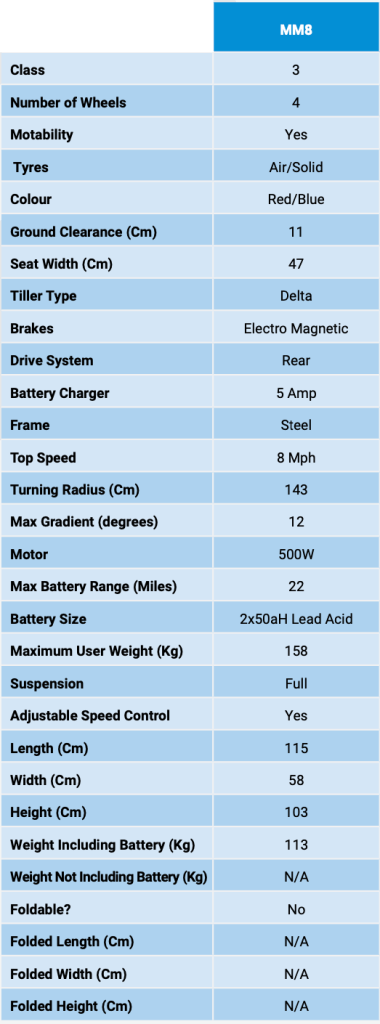 Designed to meet Class 3 regulations, the MM8 is an 8mph Mobility Scooter. This means you can register the MM8 for use on UK public roads.